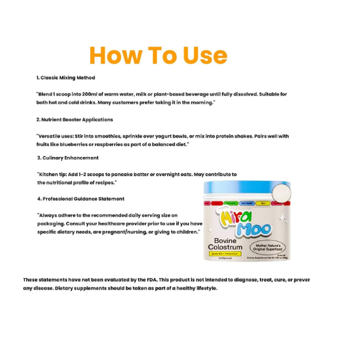 Unflavored and versatile, this colostrum powder can be easily mixed into water, smoothies, or your favorite beverages. It’s suitable for all ages and lifestyles.